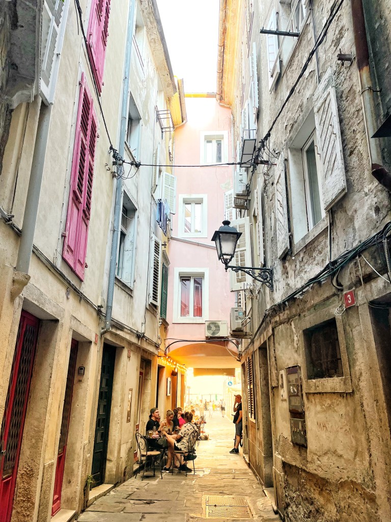 Friends enjoying cold beverages and good conversation at an alleyway cafe in a medieval town on the Adriatic coast.